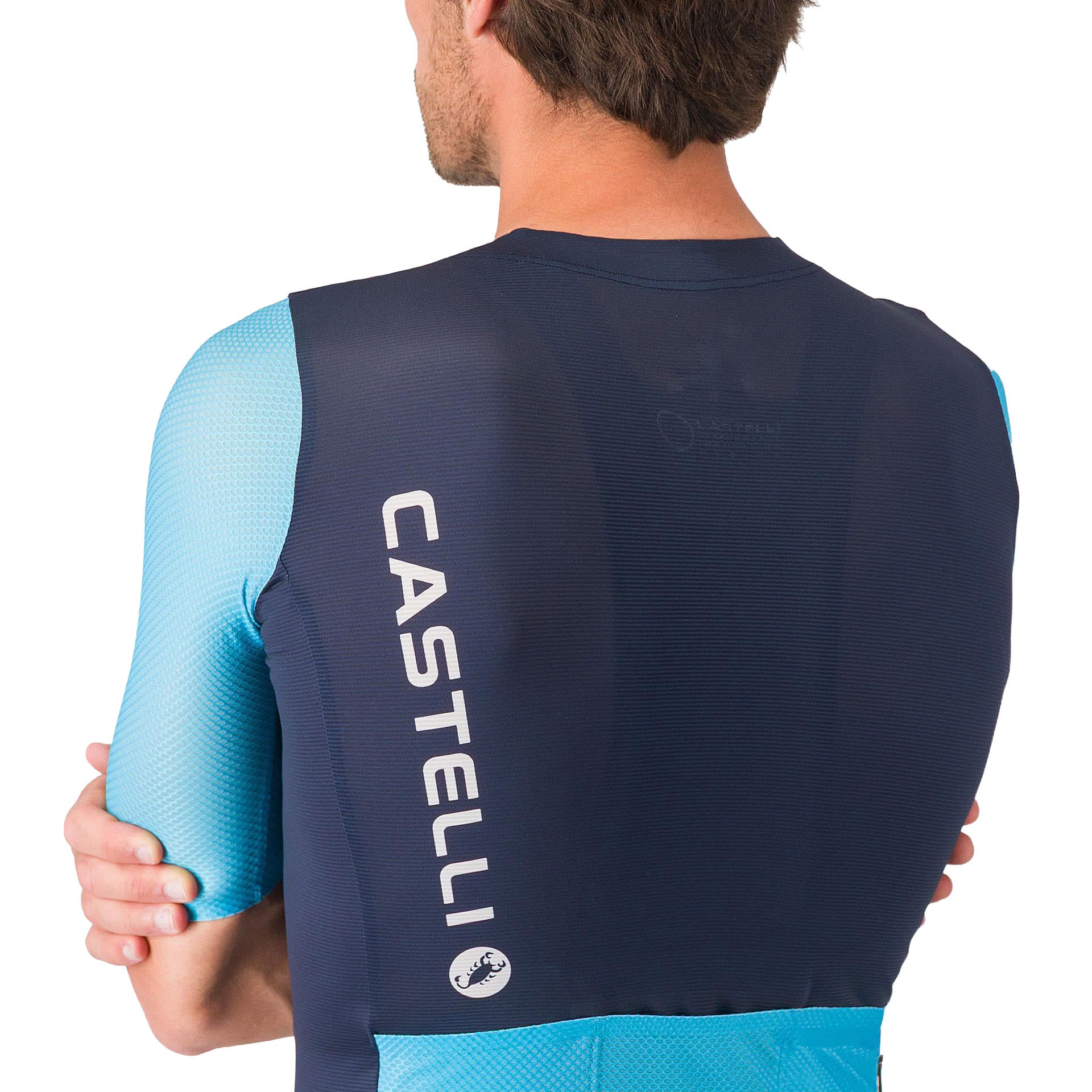 Unterschiedliche Materialien an Rumpf und Ärmeln erhöhen den Komfort in den entscheidenden Bereichen während das optimierte Gewebe gezielt Atmungsaktivität und Aerodynamik unterstützt.
