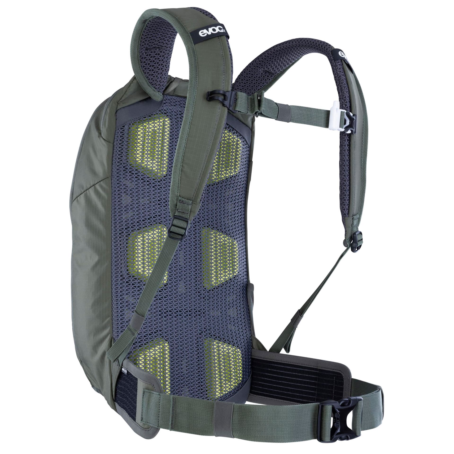 Breite Belüftungskanäle zwischen strategisch angeordneten EVA-Schaum-Pads und ein grobmaschiges Mesh-Material ermöglichen effizienten Luftdurchlass. Der 3D-geformte Stabilisator mit vorgeformten Rippen und gezielten Biege-Bereichen sorgt für eine ergonomische Anpassung an Rücken und Bewegung.
