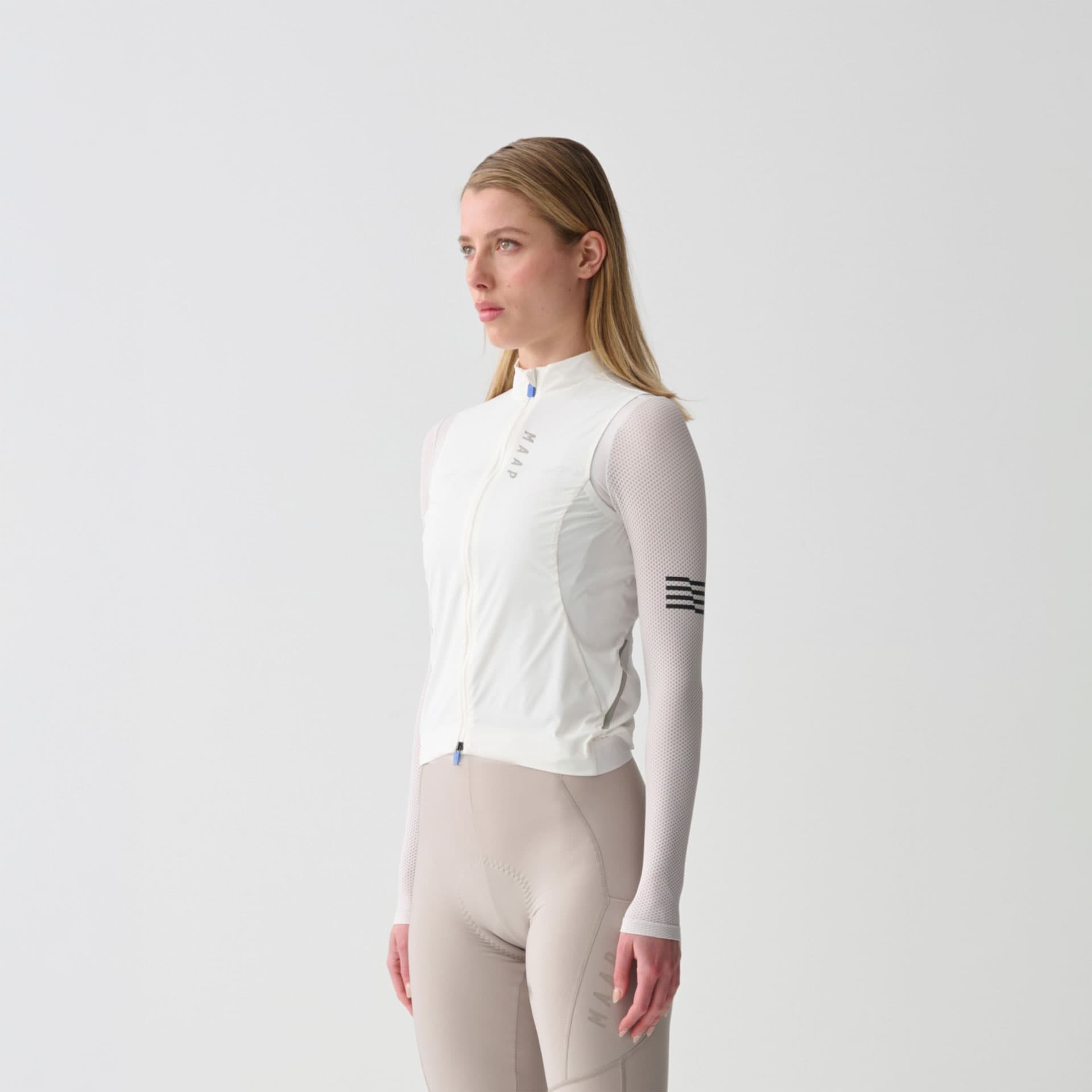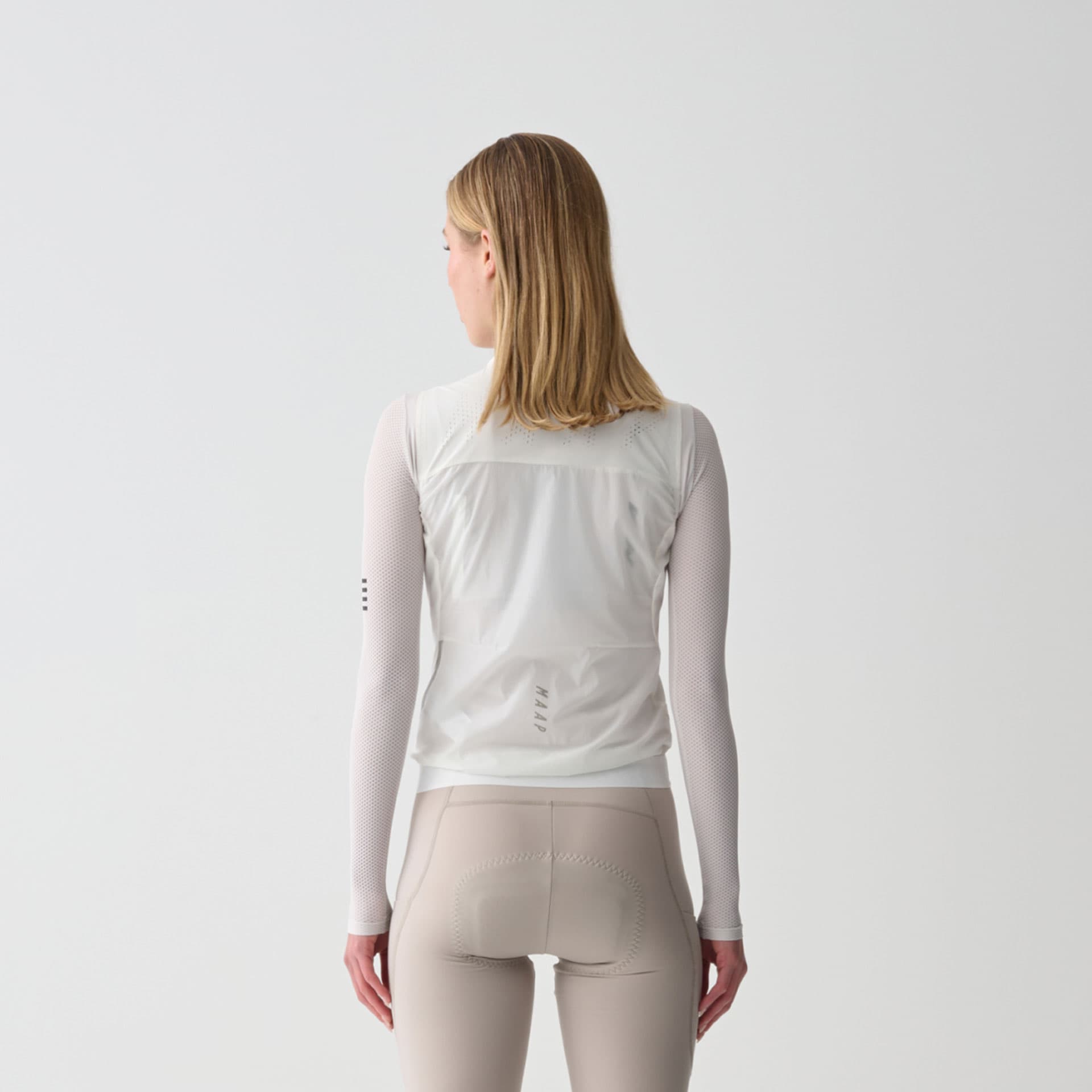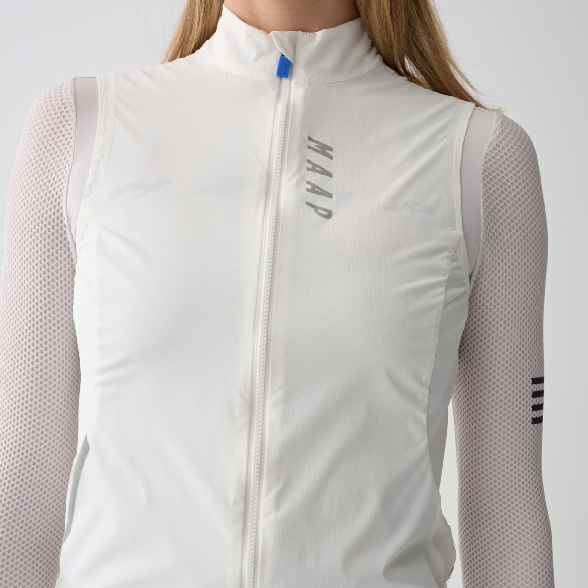 Die MAAP Womens Team Flow Vest bietet zuverlässigen Windschutz bei minimalem Gewicht und lässt sich kompakt in der Trikottasche verstauen.