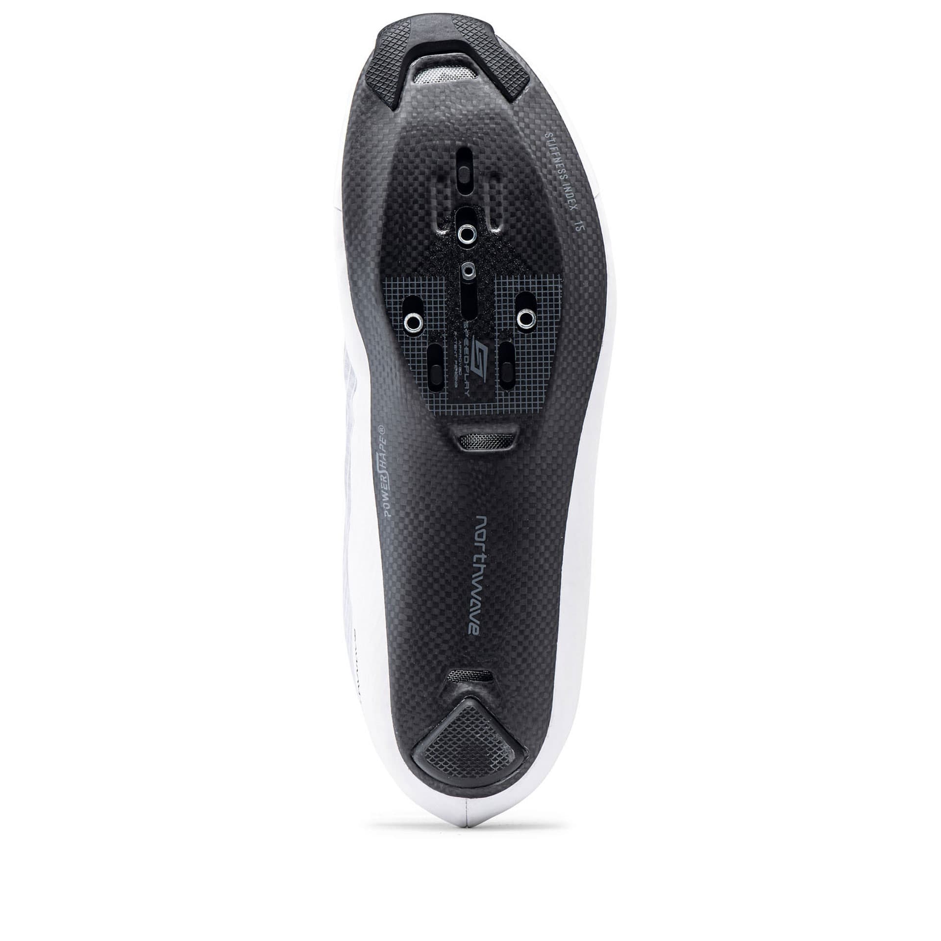 Die Powershape-Carbon-15-Sohle mit einem Steifigkeitsindex von 150 ist aus 100 % unidirektionalen Carbonfasern gefertigt und mit dem Powershape-System am Fußgewölbe ausgerüstet mit dem eine 100%ige Kraftübertragung auf die Pedale gewährleistet wird.
