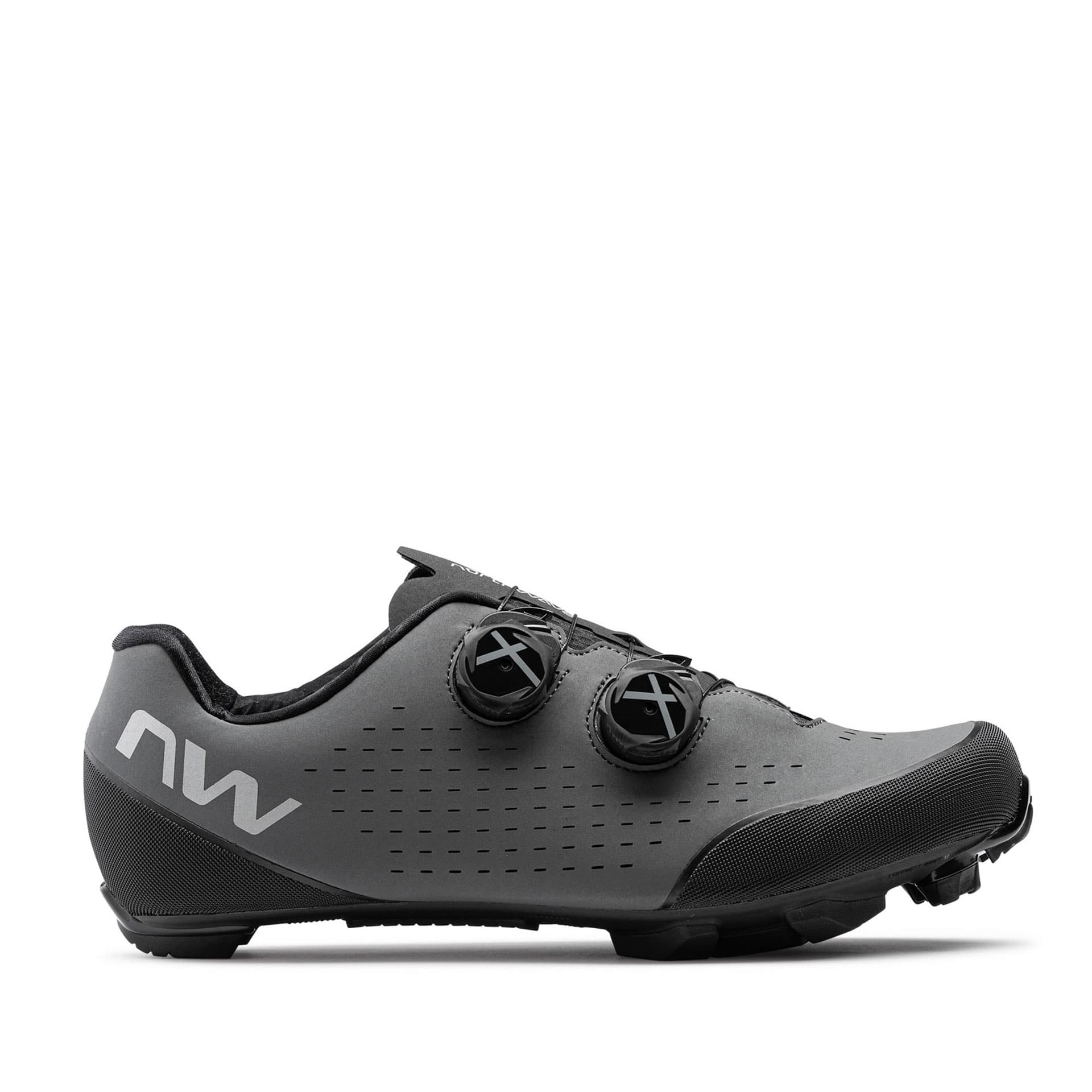 Der Rebel 3 Mountainbike-Schuh von Northwave hat eine Carbon XC12 Sohle mit einem Vollcarboneinsatz im Pedalbereich und einem Steifigkeitsindex von 120. TPU-Einsätze an strategischen Stellen sorgen für hohe Traktion und hervorragende Verschleißfestigkeit.
